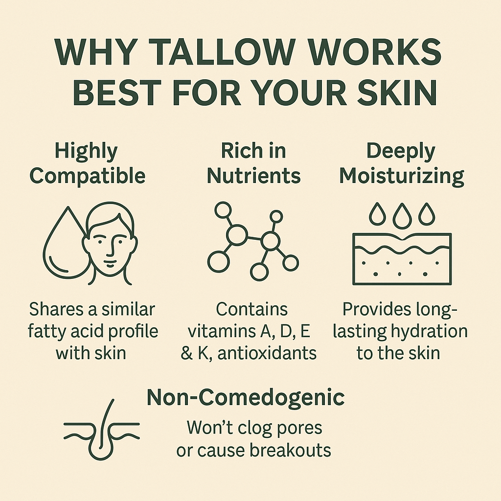 Beef tallow’s structure so closely mirrors your skin’s own natural oils that it absorbs more completely than typical plant-based moisturizers.